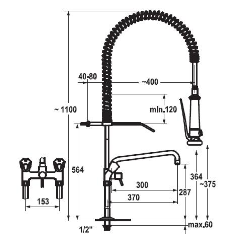 Produktinformationen "KWC Gastro K.24.42.64.000C71 Geschirrbrause mit Schwenkauslauf Doppelrohr - Zweigriffmischer"